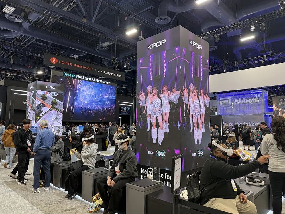 韩国乐天的展位也相当吸睛,宛如“元宇宙大观园”,入口处有许多观众戴着VR设备体验韩流演唱会,还有AI 3D扫描创建内容、虚拟形象定制、3D虚拟实境直播、虚拟影院等。