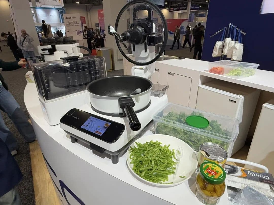 添可的炒菜机器人直接在现场炒起了菜,兼具自动炒菜、投料、洗锅能力。