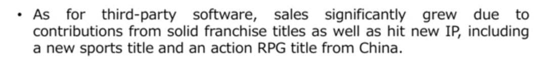 去年二季度(财季)财报电话会,索尼点名表扬了一款“新的体育游戏”和一款“来自中国的动作RPG游戏”,带动了第三方游戏业务的增长。