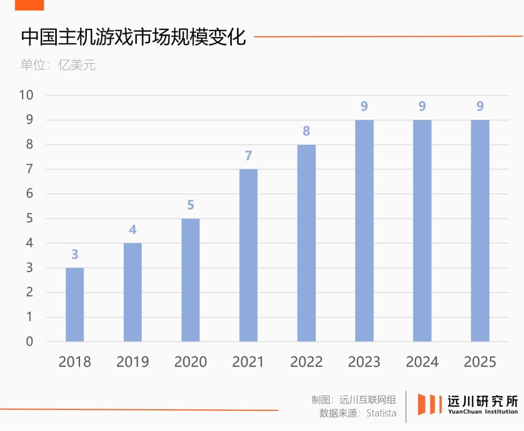根据Statista统计[8],2025年中国主机游戏市场规模预计能达到9亿美元,以此计算市场规模翻了9倍,不仅增速远超全球大盘,横向比较其他行业也绝无仅有。