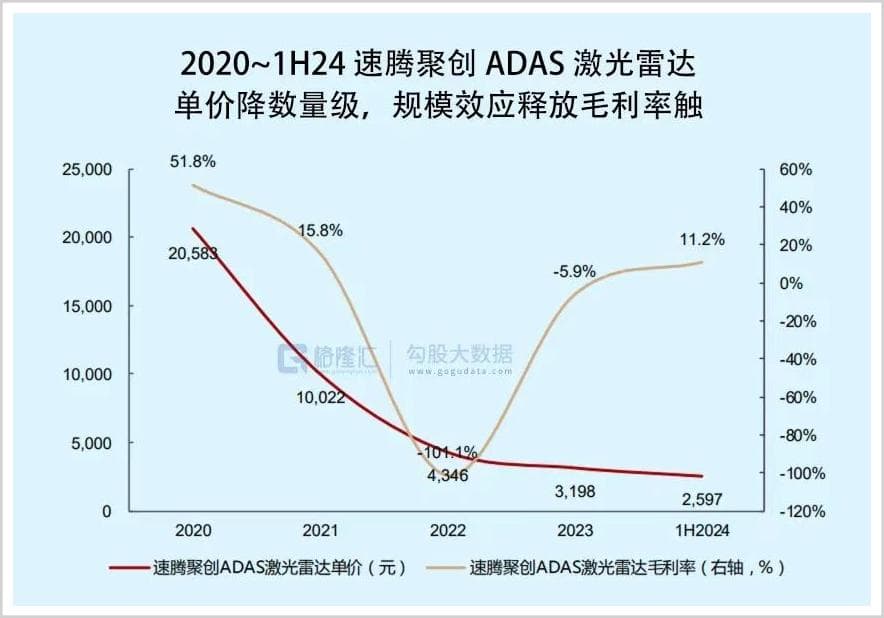 2022年之后,速腾聚创产品价格持续下探,但毛利率水平是持续向上修复的,到2024年彻底转正,并从一季度的12.3%逐季提升至三季度的17.5%。