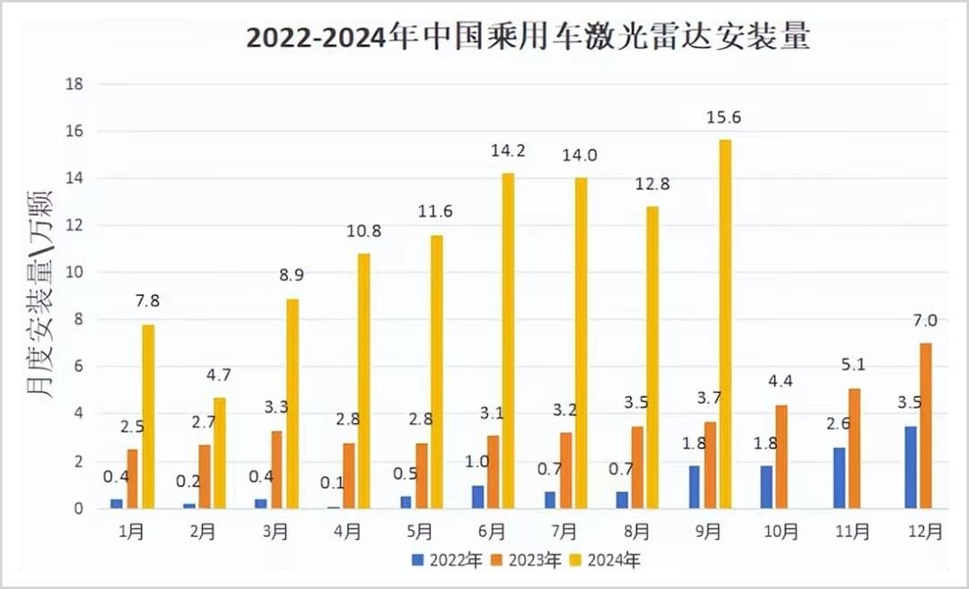 根据高工智能汽车研究院数据,2024年前三季度,中国市场乘用车前装量产激光雷达累计交付量高达100万颗,同比大增两倍,而在三年以前,这个数据大约只有现在的十分之一。