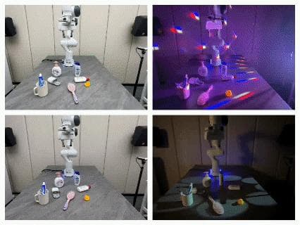 在银河通用带来的GraspVLA大模型工作展示中,我们看到在明亮、极暗甚至剧烈变化的光照条件下,模型都能精准执行抓取任务: