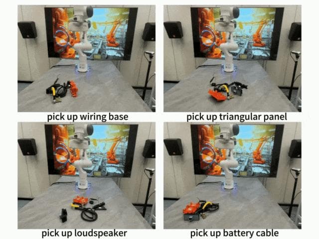 团队进一步采集了少量轨迹进行快速后训练,让GraspVLA快速掌握了诸如接线座(wiring base)、三角板(triangular panel)、黑色软管(black hose)等特殊工业名词。