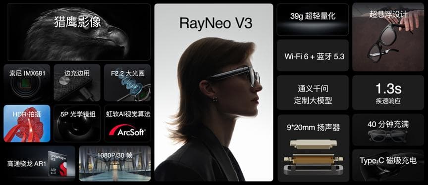 以雷鸟眼镜作为参照。2024年雷鸟眼镜还在强调背靠TCL的显示技术,今年推出的雷鸟V3不仅将价格杀到1799元,还“抱紧”阿里和高通,落地了AI SoC和AI端侧大模型(通义千问定制)。整体来看,雷鸟V3的产品完成度已经超过了Meta Ranban。拍摄、显示、AI交互、定价等环节都比Meta产品更加极致。