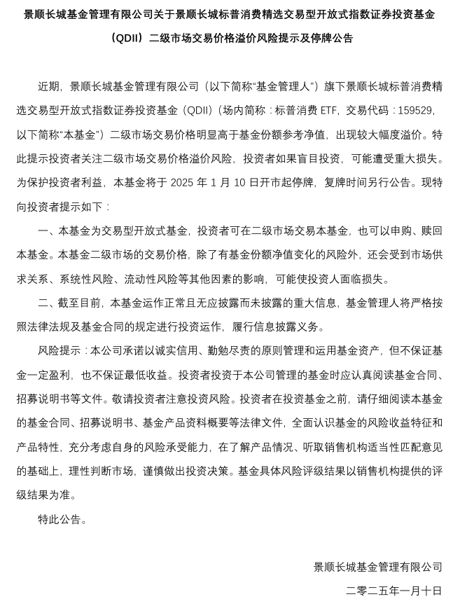 财联社1月9日讯,今日晚间,景顺长城基金管理有限公司发布公告称,近期,景顺长城基金管理有限公司旗下景顺长城标普消费精选交易型开放式指数证券投资基金(QDII)(场内简称:标普消费ETF,交易代码:159529)二级市场交易价格明显高于基金份额参考净值,出现较大幅度溢价。特此提示投资者关注二级市场交易价格溢价风险,投资者如果盲目投资,可能遭受重大损失。为保护投资者利益,本基金将于2025年1月10日开市起停牌,复牌时间另行公告。
