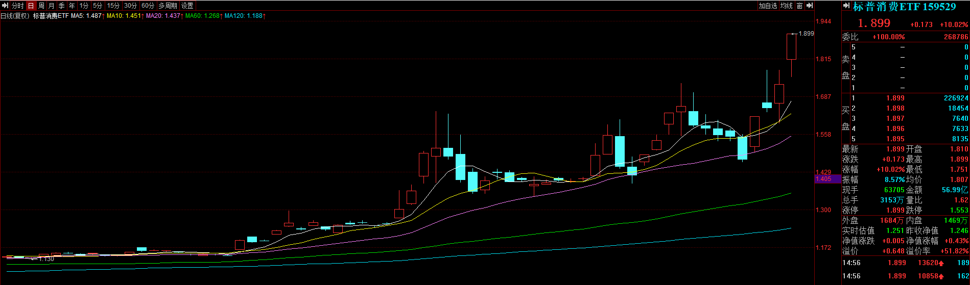 从标普消费ETF(159529)二级市场的表现来看,近期该基金价格出现大幅上涨,今日以涨停收盘,报收1.899元/份,单日换手率更是高达902.09%。截至1月8日的数据显示,标普消费ETF(159529)的IOPV为1.2508元/份,目前二级市场溢价达51.82%。
