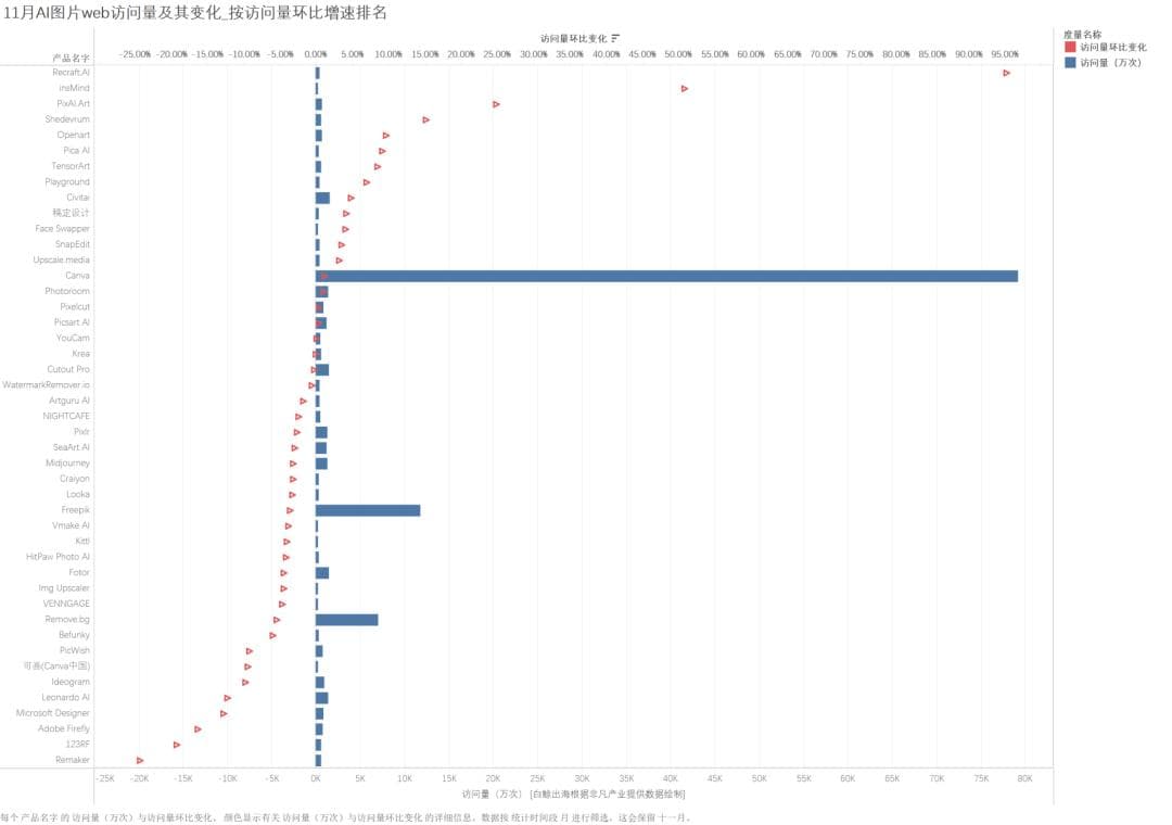 增速第 1 名为 Recraft.AI,之前因为在 10 月 31 日正式发布了专门为设计师打造的全球首个 GenAI 模型 Recraft V3,被各路博主“带货”,web 端也在 11 月终于迎来了爆发,环比增长 95.29% 排在第一,月访问量也从 200w+ 飙升至 400w+。今日的次条文章也安排了 Recraft.AI 的创始人采访,感兴趣的读者可移步阅读。