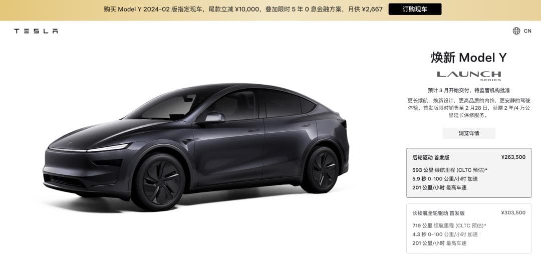 特斯拉中国官网显示,新款预计3月开始交付,待监管机构批准。特斯拉中国方表示,该款车型为史上续航最长的Model Y,续航最高719公里。