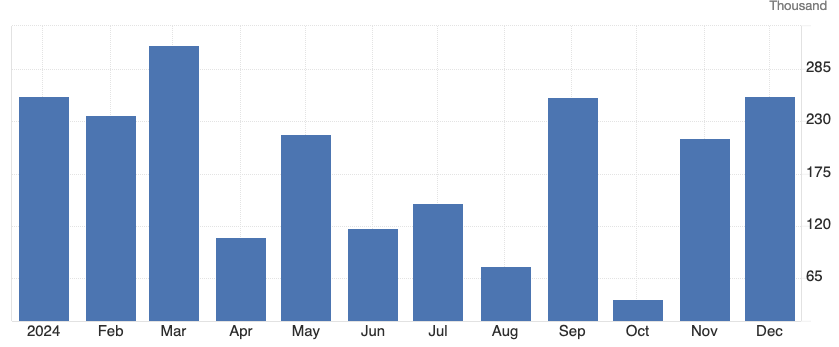 随着12月数据出炉,美国经济在2024年总共增加了220万个就业岗位,平均每月18.6万。虽然比起2023年的300万增幅有所下降,但仍高于2019年的200万。