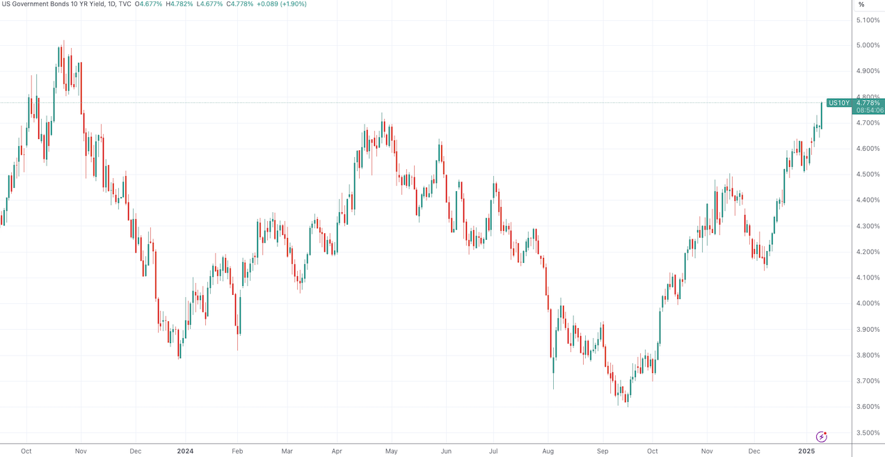 远超预期的数据发布后,美股三大期指短时跳水,纳斯达克100指数期货的跌幅一度接近1%;十年期美债收益率大幅拉升近10个基点,最高摸到4.79%的位置。