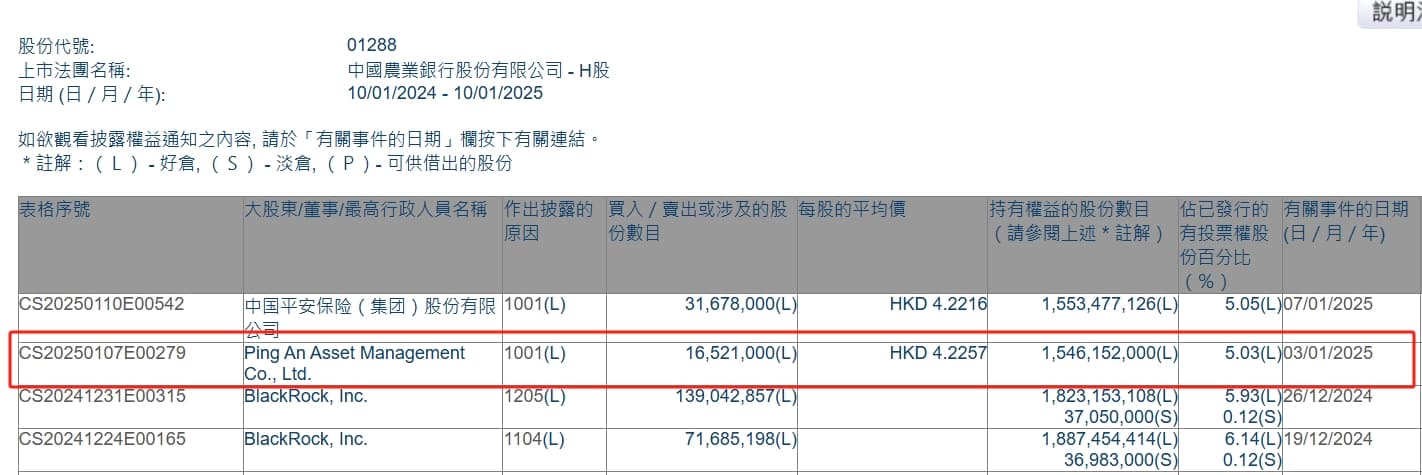 港交所数据显示,中国平安和平安资管均为首次披露持有农业银行H股比例超过5%。