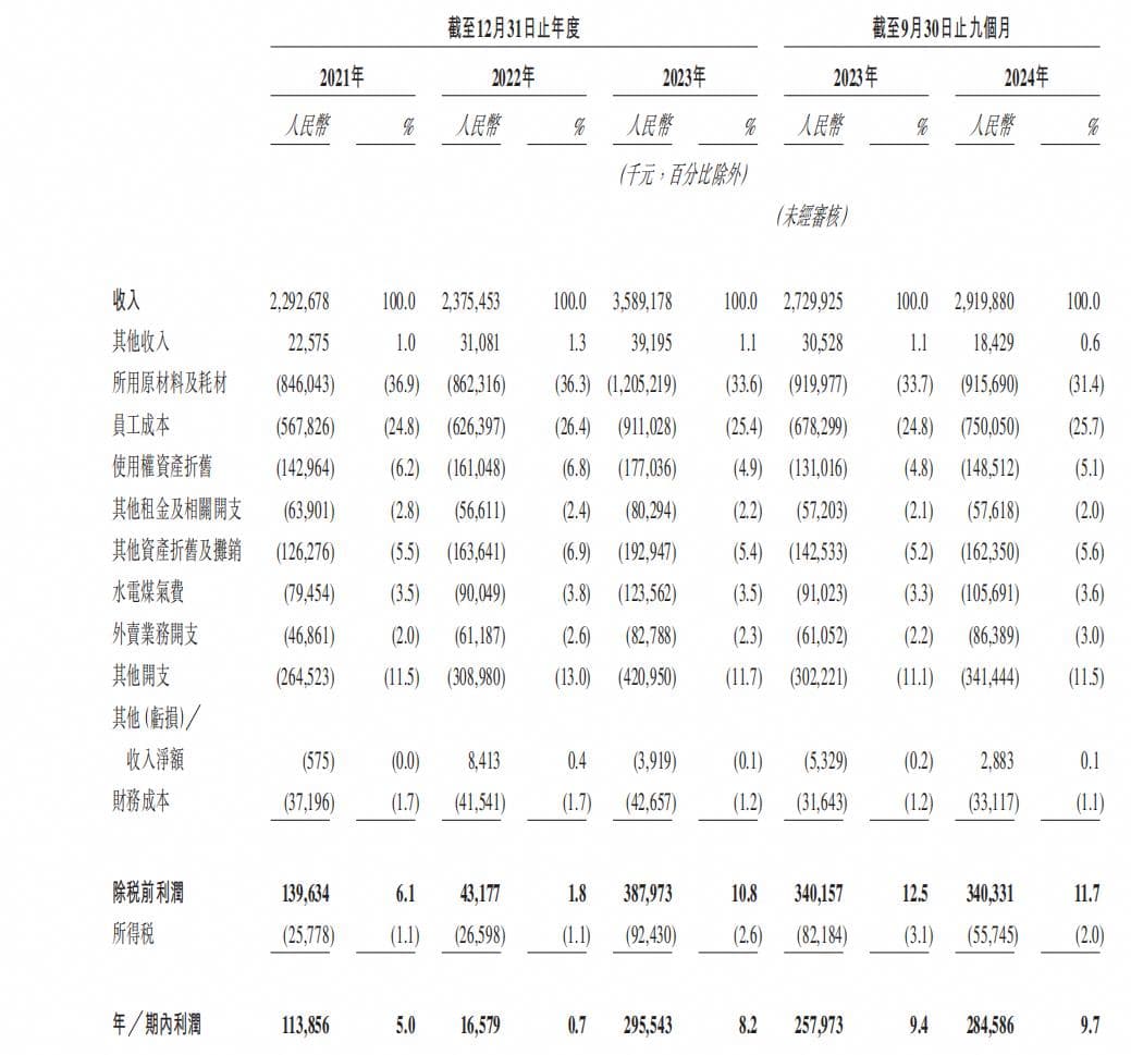 据招股书数据,近四年间,绿茶餐厅的营收、利润一直在稳步上涨,整体算是经营平稳。2024年前9个月收入29.2亿元,同比增长6.9%,净利润2.9亿元,同比增长10.4%,可以说维持住了增长态势。