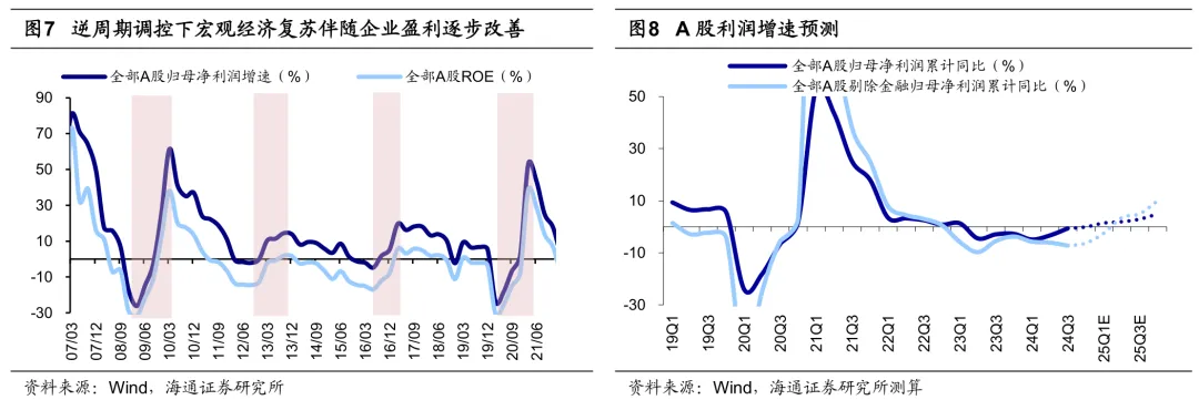 25年春季行情或正在孕育中。25年春季行情或正在孕育中。虽然近期市场整体处在震荡休整中,当前驱动春季行情启动的积极催化已经出现,未来行情展开可期。从政策面看,24/09/24以来国内宏观政策基调明显转向,24年中央经济工作会议明确提出,25年将实施“更加积极有为的宏观政策”,其中货币政策适度宽松、财政政策更加积极,还提出“稳住楼市股市”,1/10国新办发布会上财政部进一步指出“2025年财政政策方向是清晰明确的,充分考虑了加大逆周期调节的需要,是非常积极的”,后续宏观政策发力空间已经打开。此外,美国新任总统即将上任,届时海外环境有望逐步明晰。在此背景下近期市场风险偏好已有所提升,A股风险溢价率从9月的4.70%降至当前的3.98%。从资金面看,1/3-1/4中国人民银行工作会议明确25年“实施适度宽松的货币政策”,预计接下来货币政策将进一步发力,流动性环境维持偏松,不排除今年1月降准和降息的可能性。从基本面看,底部政策发力正逐步显效,部分经济数据已出现改善,例如11月商品房销售额同比回正至1.4%,为23年4月以来单月最高;11月工业增加值同比为5.4%,超市场预期。展望25年,随着增量政策出台落地,宏微观基本面有望加速修复,A股归母净利润增速预计达5%-10%。因此,无论从政策催化、流动性,还是基本面角度看,今年春季行情均值得期待。