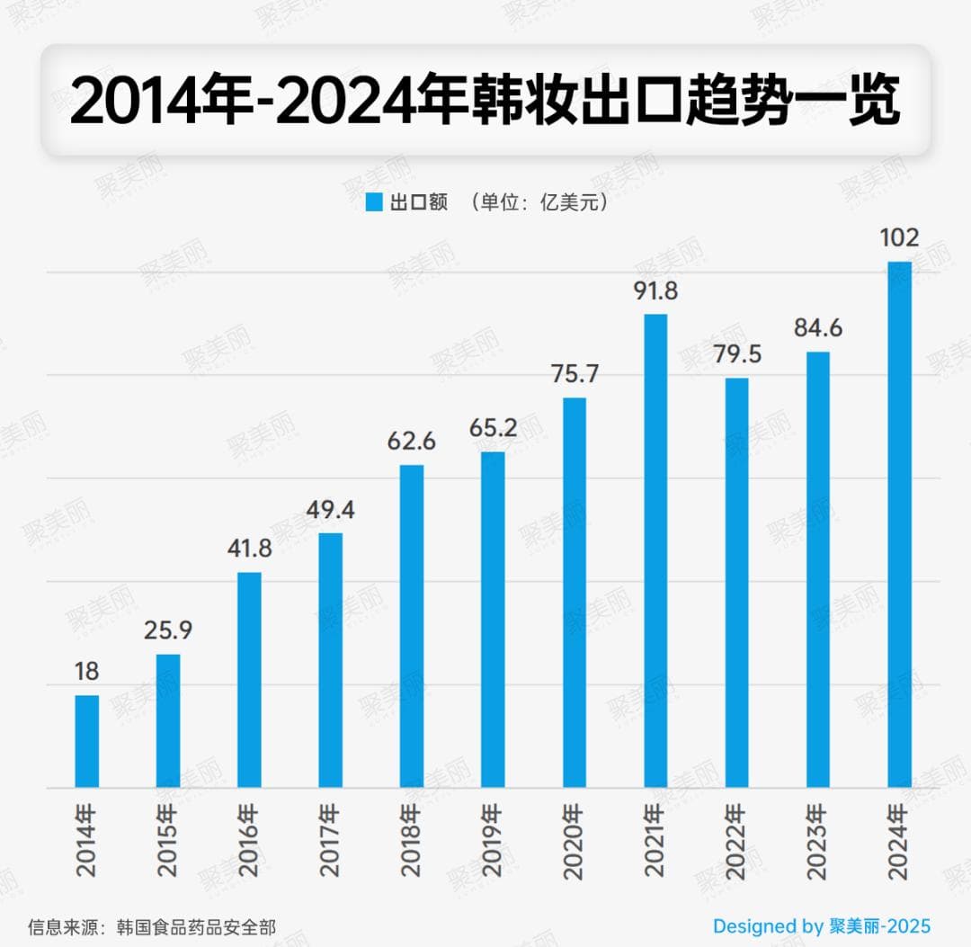 而在2021年之后,韩妆出口开始波动,从前一年的超90亿美元的出口额下滑至80亿美元(约合人民币586亿元)上下,又在2024年增至百亿美元。