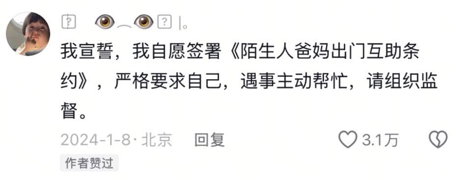 这一次我帮助了你的爸妈,有可能下一次你就会帮到我的爸妈。这属于陌生人之间温暖的默契约定,被叫做“陌生人爸妈出门互助条约”。