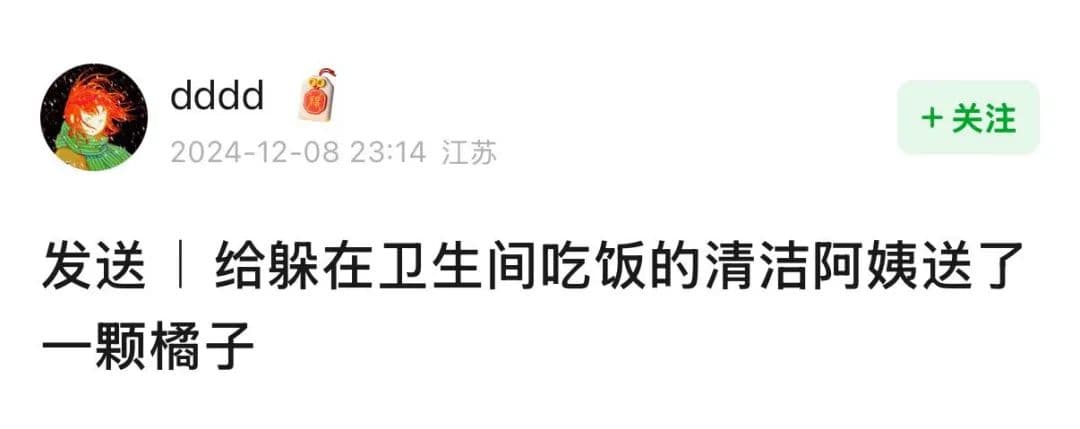 还有人在逛商场的时候给躲在卫生间里吃饭的保洁阿姨送了一颗橘子。