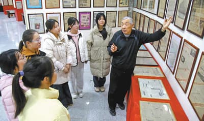 湖北省十堰市郧阳区培长报纸博物馆,馆长程培长(右一)向参观者介绍他收藏的报纸。