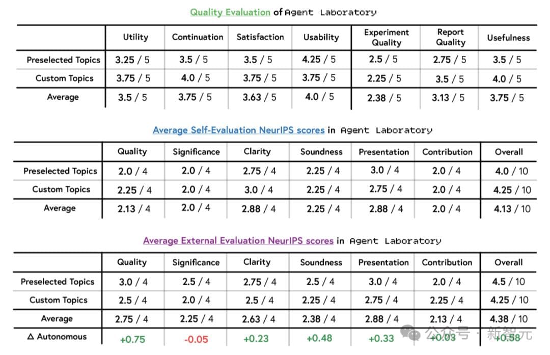 所有模型的得分均低于NeurIPS的平均分,表明生成的论文在技术性和方法论的严谨性上显著不足。凸显了进一步优化Agent Laboratory的必要性,让其生成的内容符合高质量出版物的标准。