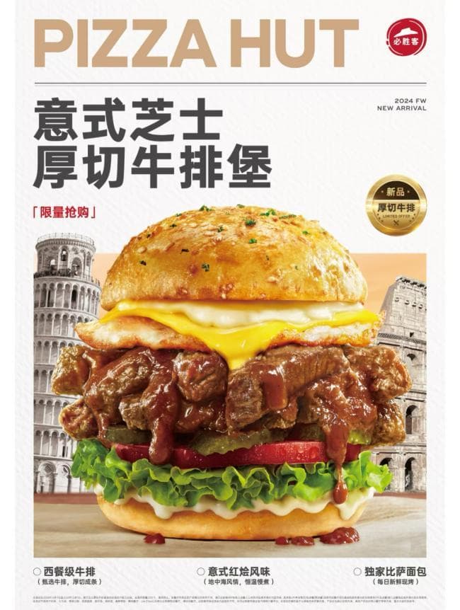 2024年4月,必胜客推出“比萨堡”,就餐场景从原来的伙伴聚餐分享披萨拓展到一个人也能享用比萨堡。根据必胜客相关负责人表示,一个人吃饭的场景下,消费者需要得到更多选择和服务,希望通过比萨堡,满足人们自己吃饭也要厚待自己的需求。