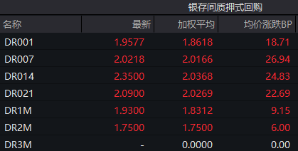 银银间回购定盘利率全线上涨。FDR001涨18.0个基点报1.85%;FDR007涨28.0个基点报2.0%;FDR014涨20.0个基点报2.0%。