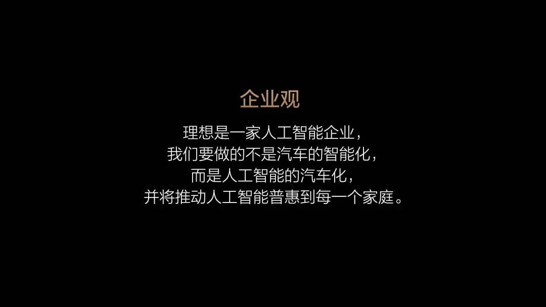 然后就是理想创始人李想在去年年底亮相接受专访,直接表示理想的定位和愿景:理想是一家人工智能企业,致力于人工智能的汽车化,推动人工智能普惠到每一个家庭。