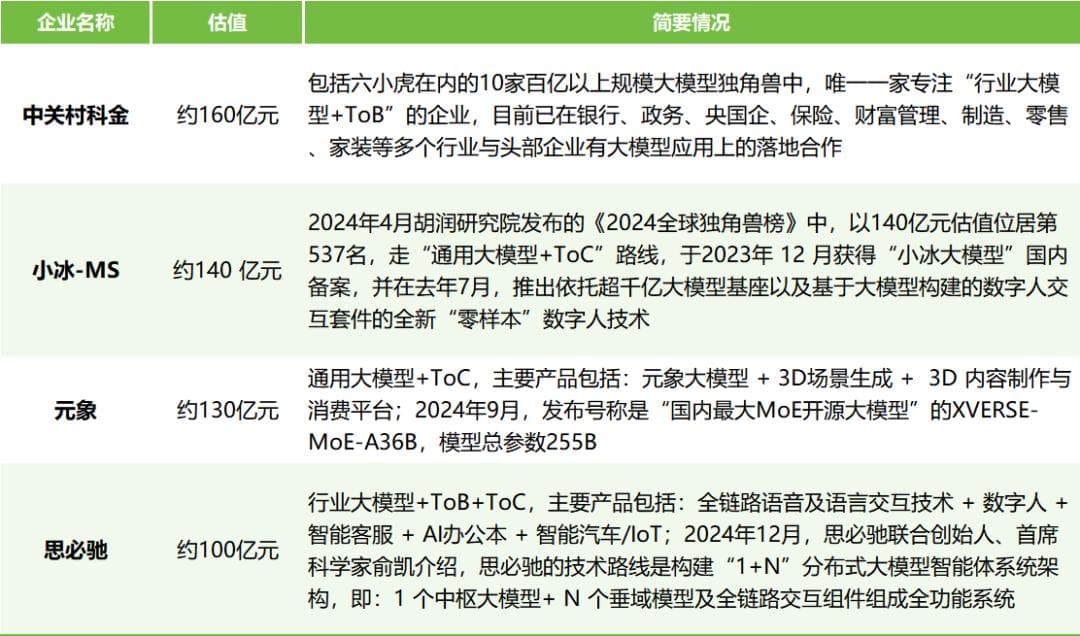 六小虎之外,2024年,市场上还至少出现了其余4家估值在百亿元以上规模的大模型独角兽——中关村科金、小冰-MS、元象以及思必驰。