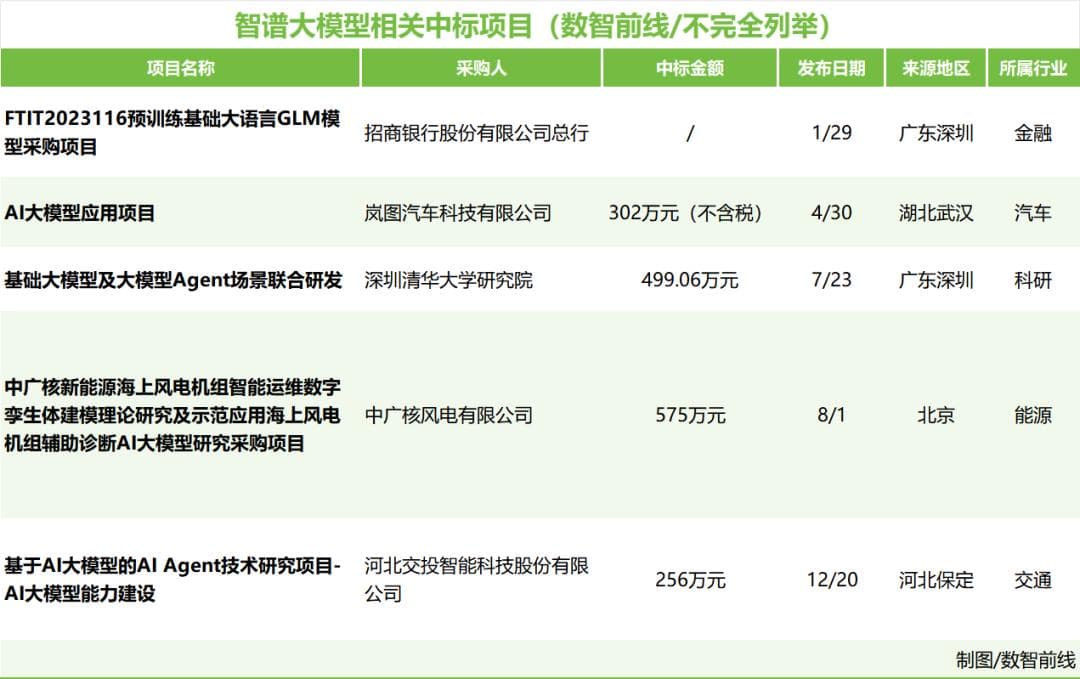 据数智前线不完全统计,2024年,智谱至少中标了28个大模型相关项目,涉及能源、金融、教育、汽车、政务、运营商、科研、交通物流等多个领域。其中,不仅包括基础大模型、应用项目的采购,也包含了人才培训项目。