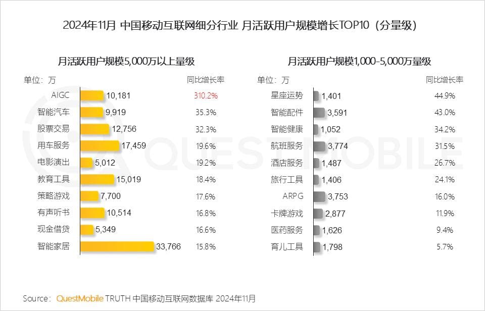 具体来看,截止到11月,月活跃用户规模在5000万以上的行业中,同比增速前五位的分别为AIGC、智能汽车、股票交易、用车服务、电影演出,增速分别为310.2%、35.3%、32.3%、19.6%、19.2%。