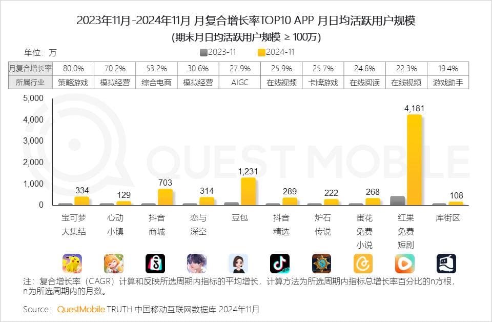 1、【日均活跃用户数100万以上黑马APP】多款手机游戏爆火,其中《宝可梦大集结》《心动小镇》月复合增长率均超70%;抖音系在电商、AIGC、视频多领域开花