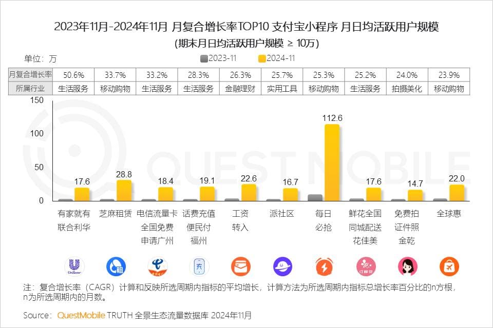 3、支付宝增长黑马小程序多集中在生活服务、移动购物领域,品牌会员积分管理、租赁服务、话费充值等小程序流量增速显著