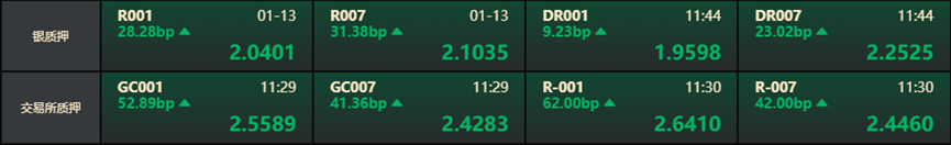 DR001、R001、ShiborO/N早盘悉数大幅上行,其中DR001和DR007分别上行9.23bp和23.02bp至1.9598%和2.2525%。资金盘全线飘绿,代表非银机构资金面情况的GC001早盘更是一度上行123.5bp飙升至3.315%。