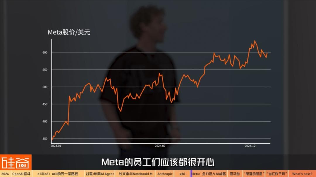 除了创始人扎克伯格最近的突变形象和婚姻八卦之外,脸书毫无疑问是2024年的科技大赢家之一:单从股价就能看出来,2024年涨了70%左右,Meta的员工们应该都很开心 。
