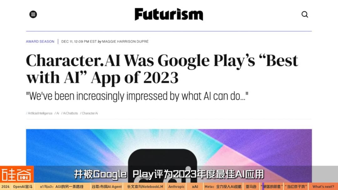 2023年5月,Character.AI在苹果App Store和Google Play Store发布了移动应用程序,第一周下载量就超过170万次,并被Google Play评为2023年度最佳AI应用。