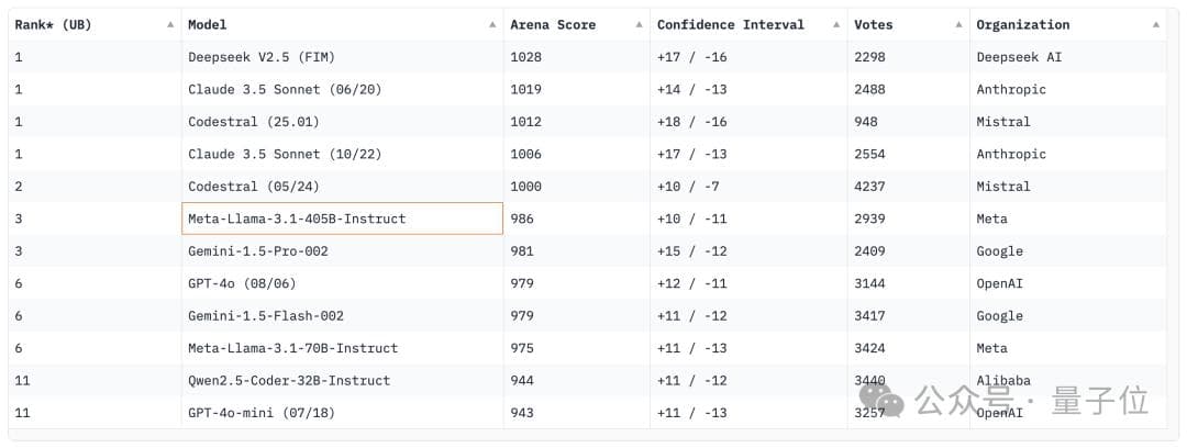而且与 DeepSeek V2.5 和 Claude 3.5 平起平坐,共同位列 Copilot 竞技场第一名。