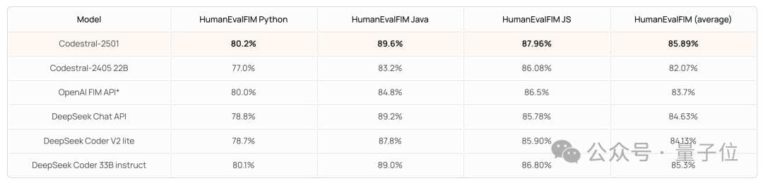 结果平均成绩以及 Python、Java 和 JS 三个单项相比前一代均进步明显,且优于 OpenAI FIM API(最新版是3.5 Turbo)等其他模型(不过紧随其后的 DeepSeek 咬得很紧)。