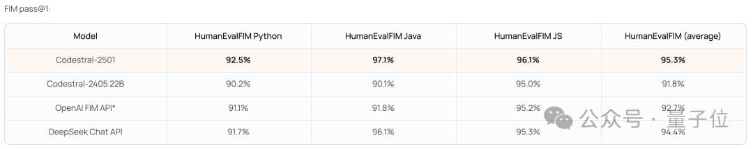 除了生成,Mistral 团队也发布了 CodeStral 2501 的 FIM 表现(单行精确匹配)。