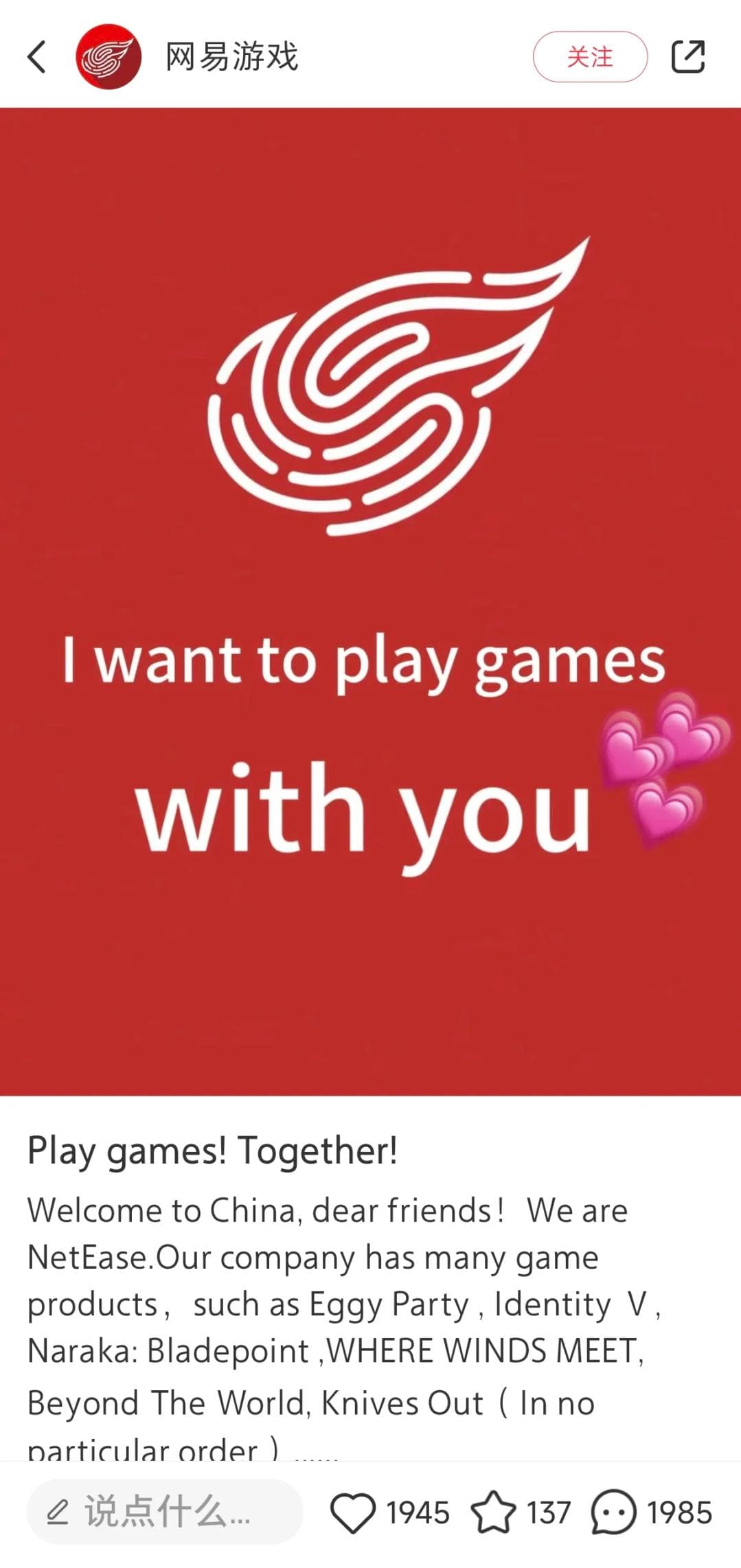 而小红书上动作最快的国内游戏厂商还得是网易,他们发布了一条「I want to play games with you」的帖子,向这批「TikTok难民」发出邀请并简要介绍了自己。但整篇内容的用语表达显得稍微太不正式,评论区也多是「收手吧这里都是自己人」的回应。网易随即删除了该条动态。