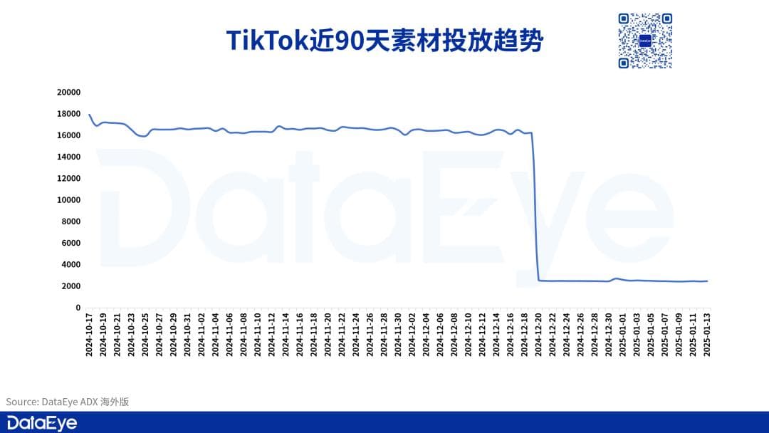 近年来用户规模不断飙升的TikTok逐渐成为出海游戏厂商买量的重要选择之一。DataEye ADX海外版显示,TikTok在去年下半年日均投放素材可以达到1.6万组,但在12月19号美国最高法院将审理TikTok禁令案的消息一出之后,投放素材量猛跌至日均 2400组——禁令案这把「达摩克利斯之剑」,始终左右着TikTok买量的走向。