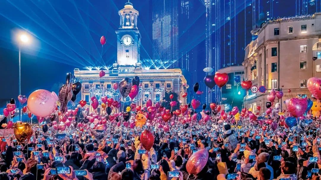2024年12月31日,湖北武汉。汉口沿江大道上,新年气氛正浓,不少市民、游客齐聚江汉关大楼前,共同迎接2025年的到来。(图/视觉中国)