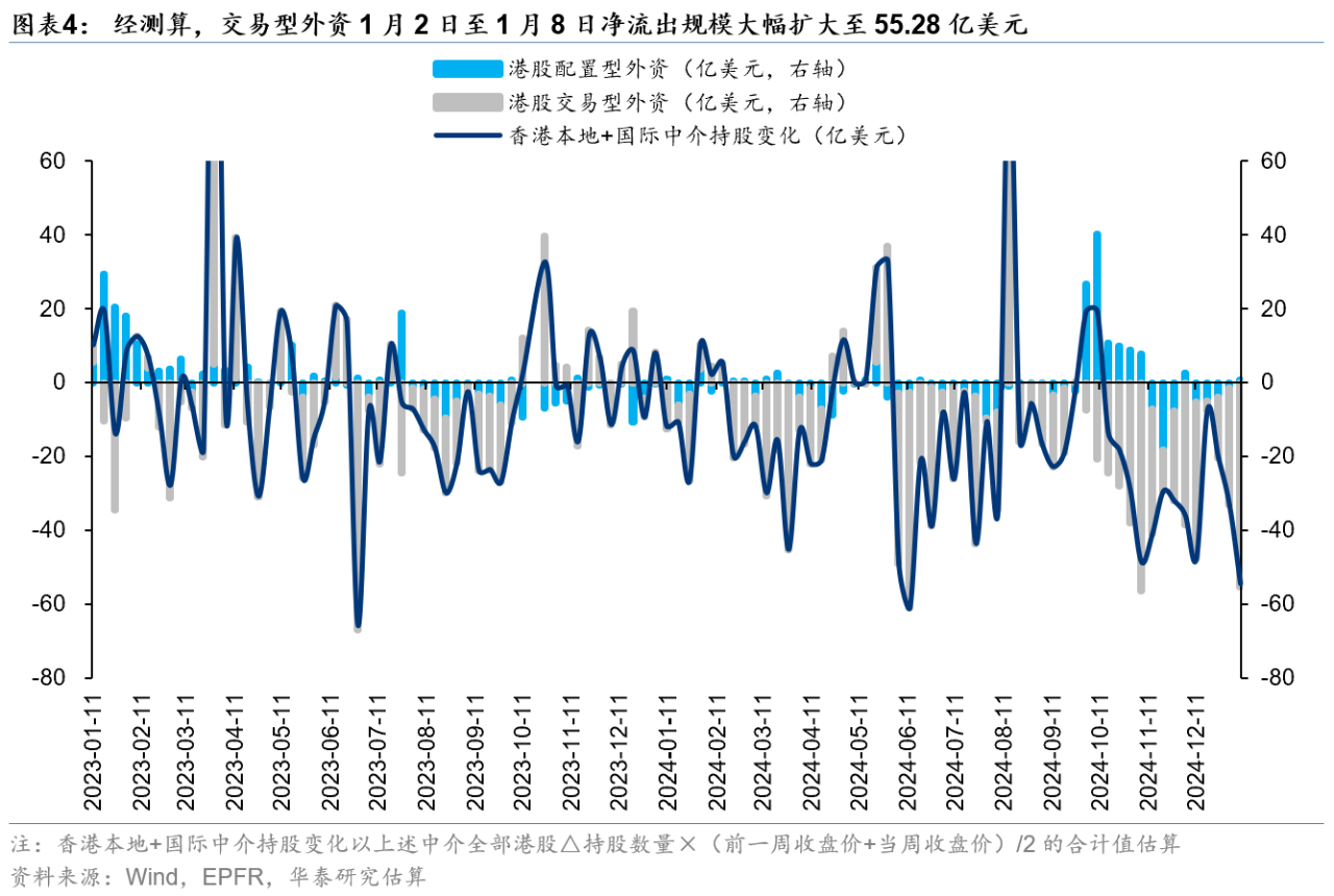 交易型外资净流出规模扩大。以Wind统计的香港本地及国际中介持股变化估算流量(近似代表港股外资流量),与EPFR口径下港股配置型外资流量的差值,近似代表港股的交易型外资,1月2日至1月8日净流出规模大幅扩大至55.28亿美元(vs前一周净流出31.70亿美元)。