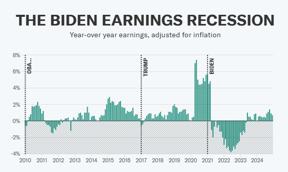 因此,在拜登担任总统期间,美国普通家庭确实没能跑赢通胀:物价上涨幅度超过收入上涨幅度,这意味着典型的薪水在年底所能购买的东西往往比年初要少。