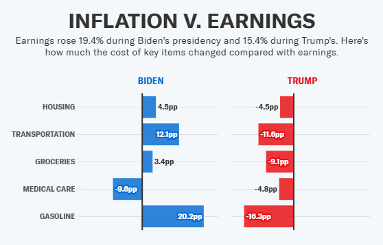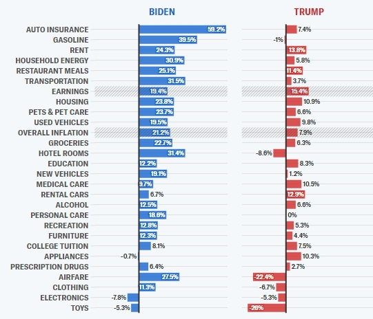 选民们更信任特朗普在通胀问题上的表现——由于两人任期相连,数据也确实支持着他们的这一观点,并能提供直观对比。