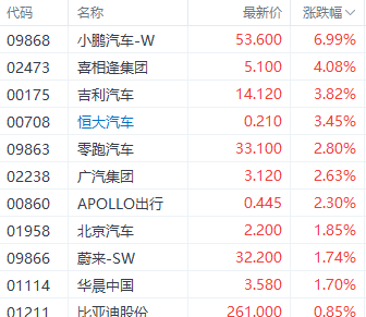 汽车股中,小鹏汽车-W(09868.HK)、吉利汽车(00175.HK)、广汽集团(02238.HK)分别上涨6.99%、3.82%、2.63%。