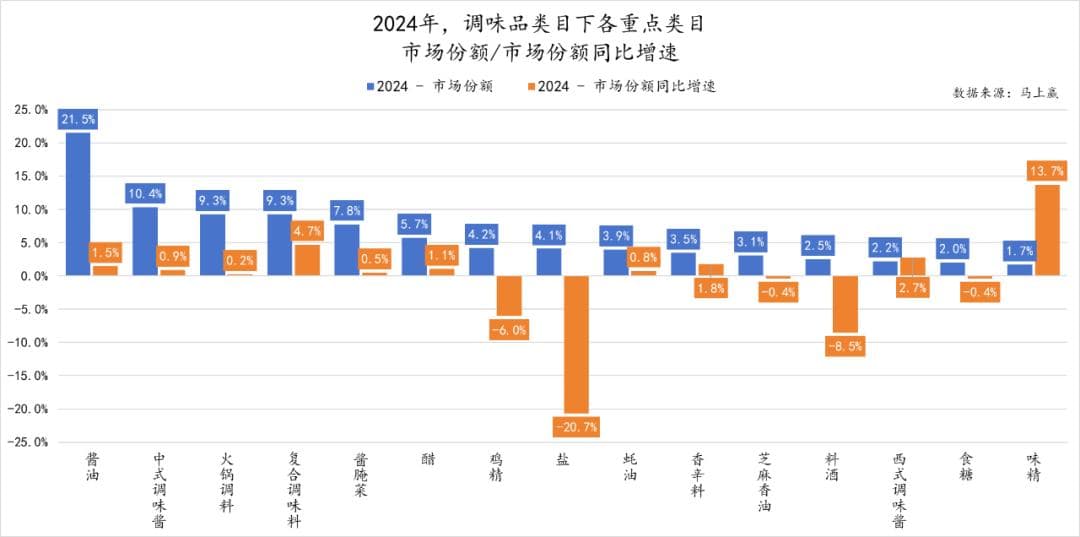 从市场份额同比增速来看,盐和味精则成为了两个极端。盐凭借-20.7%的同比增速领跌,或与2023年曾经发生过的囤积食盐风波导致当年销售基数较高相关。而味精13.7%的正增长速度,或与近两年关于味精不健康的观点正在消退密切相关。
