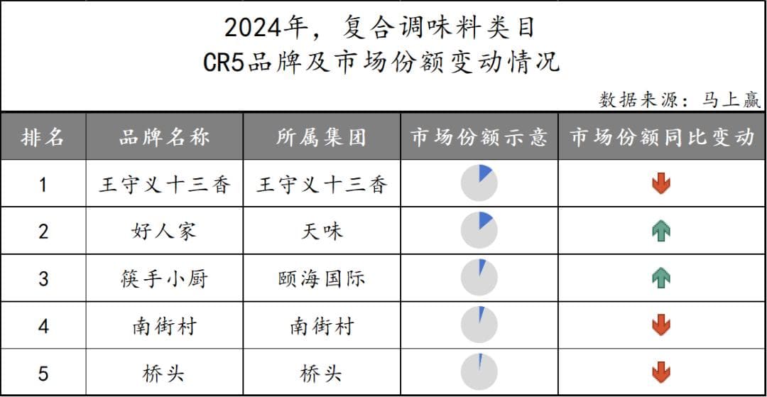 在香辛料市场中,市场份额排在前五位的品牌分别为王守义十三香、味好美、乐畅、肖家香以及鸿兴源,五大企业所占市场份额总计相对较小。同比来看,仅有排在第二、三位的味好美和乐畅份额有所提升。在此情况下,市场份额略高一些的王守义十三香市场地位也并不算稳固,CR5的排序仍在未来有较大的变动可能。