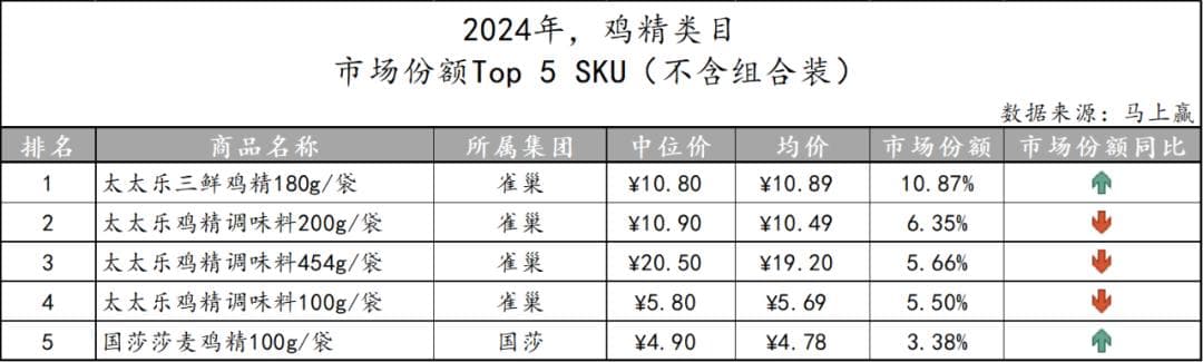 基于SKU销售额在类目销售额中的份额来看类目中的Top SKU,在TOP5 SKU中,雀巢集团旗下四款产品共占据了接近30%的市场份额,且其中三款为不同规格的太太乐鸡精调味料。但需要注意的是,三款产品中两款产品的市场份额同比下滑。