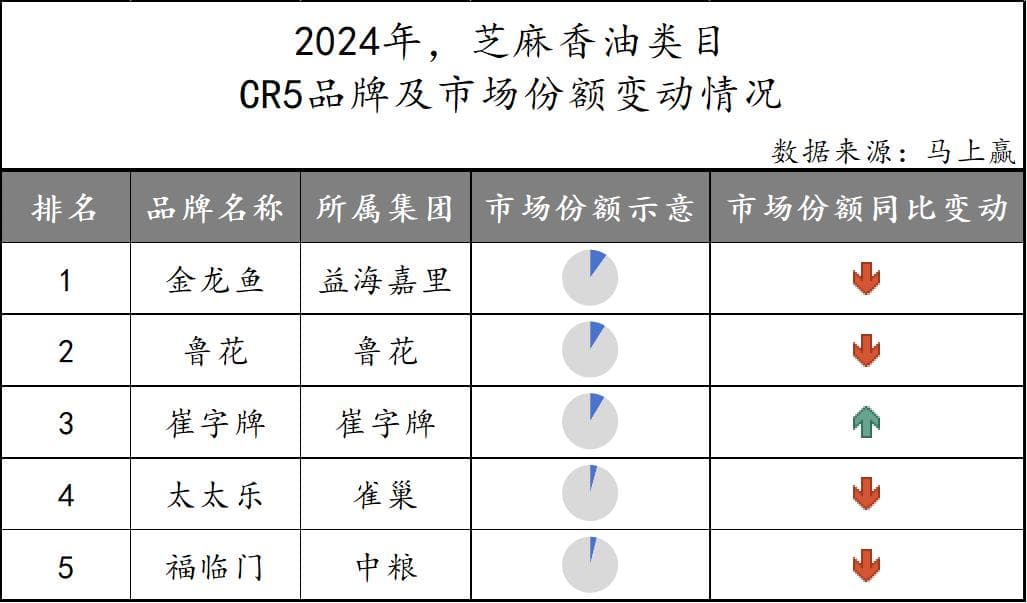 基于SKU销售额在类目销售额中的份额来看类目中的Top SKU,在2024年的TOP5 SKU中,鲁花、益海嘉里各占两款,崔字牌仅有一款。仅有鲁花的一款产品呈现市场份额同比增长,其余四款均呈现市场份额同比下跌。