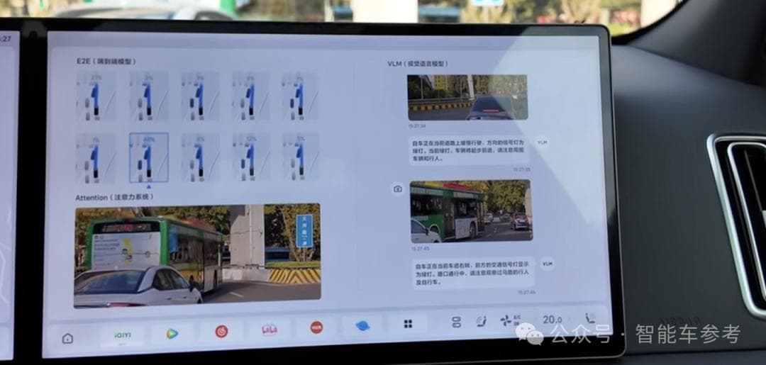 快的是端到端模型本身,应对实时驾驶任务,也就是可视化屏幕上左侧概率路线和注意力的部分;慢的则是VLM大模型,用来学习常识,应对未知路况,比如潮汐车道等等,对应屏幕右侧的实时解说部分。