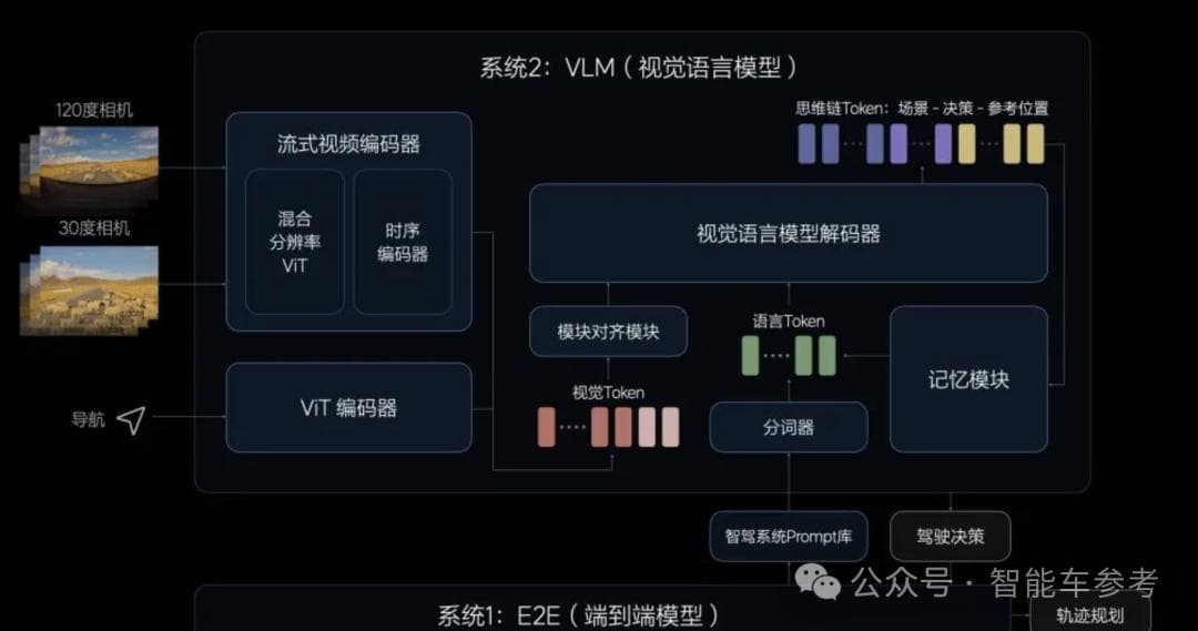至于VLM,本质是一个多模态大模型,作用是智能驾驶“点读机”,哪里不会点哪里,利用大语言模型的认知能力理解场景,输出另外一条行驶轨迹给端到端模型参考修正。